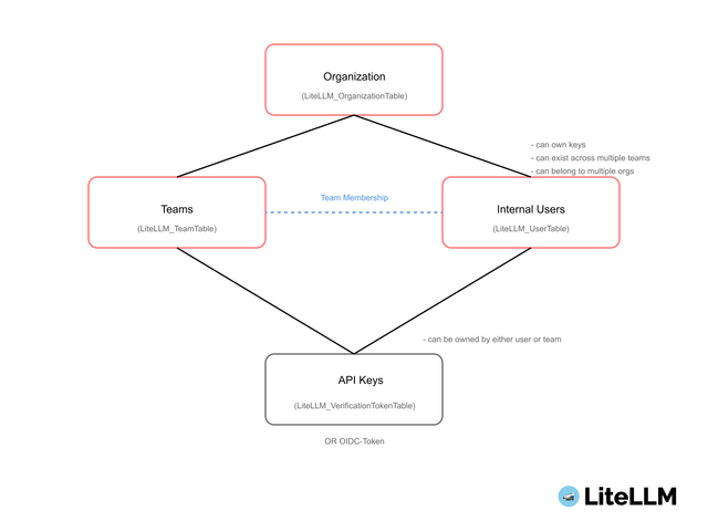 Organizationsare the top-level entities that contain Teams.Team- A Team is a collection of multipleInternal UsersInternal Users- users that can create keys, make LLM API calls, view usage on LiteLLM. Users can be on multiple teams.Virtual Keys- Keys are used for authentication to the LiteLLM API. Each key can optionally be associated with auser_id, ateam_id, or both:- User-only key: Has a